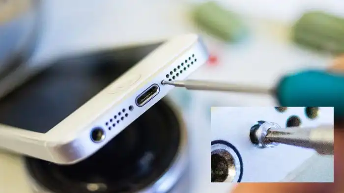 В торце айфона есть два стула два винта, которые нужно аккуратно вывинтить. После этого наступает очень важный момент, на который мало кто обращает внимание. Необходимо взять оба винтика и положить их в коробочку! СРАЗУ! Иначе винтики будут ПОТРАЧЕНО, это закон! По-другому не бывает, просто положите их в коробочку – потом будете меня благодарить, вместо того, чтобы ползать по полу всей семьей.