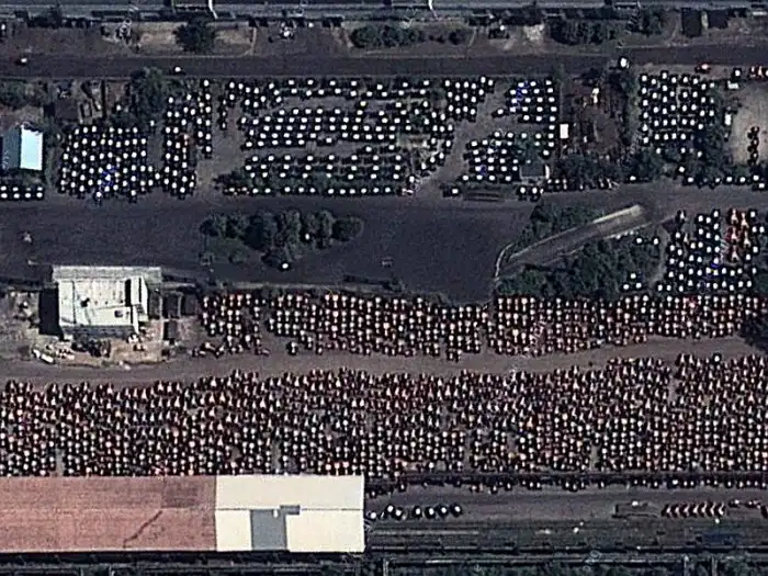 Ситуацию с реализацией продукции беларуских предприятий многие эксперты называют если еще не катастрофической, то, как минимум, уже угрожающей. Признают проблему и сами власти Беларуси: недавно президент страны Александр Лукашенко распорядился немедленно разгрузить склады промышленных предприятий путем передачи техники в колхозы и СПК со скидкой до 30%, с привлекательной рассрочкой и по выгодным лизинговым схемам. Не далее как в последних числах мая устроил разнос минским чиновникам и мэр беларуской столицы Николай Ладутько. По его словам, предприятия Минска уже потеряли рынки сбыта в 44 странах, а складские запасы растут угрожающими темпами. Но наибольший скандал в Беларуси вызвала публикация местного журналиста Глеба Лободенко, который обнаружил на спутниковых снимках Google Maps тысячи непроданных тракторов, стоящих на огороженной территории МТЗ. Тут же откликнулись и рабочие самого завода, приславшие в редакции некоторых СМИ фото, сделанные на мобильные телефоны внутри этой территории: трактора на них стояли практически на всех свободных площадях, включая газоны и внутризаводские пешеходные проходы. Вскоре последовал комментарий представителей властей: мол, фотографии старые, 2-3-летней давности, когда со сбытом продукции действительно были серьезные проблемы, а сейчас все совершенно иначе. Корреспондент РСН решил выяснить, так ли это на самом деле, и отправился на Минский тракторный завод. Разумеется, попасть на огороженную и отлично охраняемую территорию оказалось невозможно, но разглядеть кое-что с помощью "дальнобойной" оптики все же удалось.