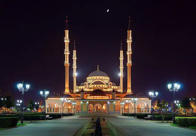 Мечеть «Сердце Чечни» в Грозном считается одной из самых больших, красивых и величественных мечетей Европы и мира. Открыта 17 октября 2008 года и названа именем Ахмат-Хаджи Кадырова, первого президента Чеченской Республики. Мечеть располагается на живописном берегу реки Сунжи, посреди огромного парка с каскадом цветных фонтанов и ночным освещением. Наружные и внутренние стены мечети отделаны мрамором, а 36 люстр, установленных в мечети, своими формами напоминают три главные святыни Ислама: 27 люстр имитируют мечеть Куббату-ас Сахра в Иерусалиме, 8 сделаны по образцу мечети Ровзату-Небеви в Медине и самая большая, восьмиметровая люстра, повторяет по формам святыню Кааба в Мекке. На создание коллекции эксклюзивных люстр ушло несколько тонн бронзы, около трех килограммов золота и более одного миллиона деталей и кристаллов Swarovski.