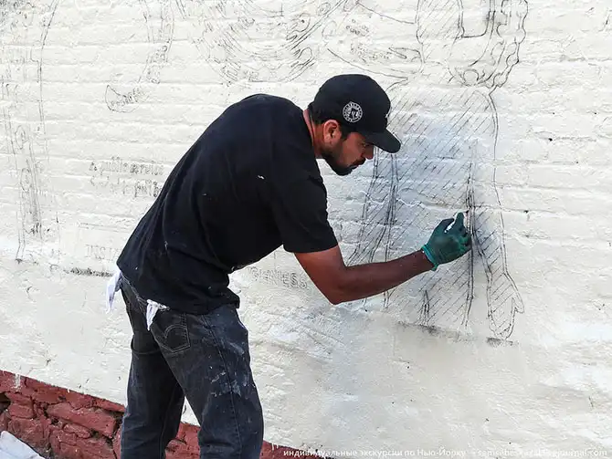 Широкоформатная печать, особенно на больших форматах, получается очень зернистой. Это хорошо видно, когда вы смотрите на такую рекламу вблизи. Здесь художник внимателен даже к мелким деталями, поэтому картина выходит более яркой и четкой. Рисуют в основном кисточками, но при необходимости используют валик, чтобы сразу закрасить большую площадь одним цветом. Над большими проектами обычно работает два художника. Маленькие рисует один. На одну стену уходит несколько дней. День на разметку и минимум два-три на рисование. За неделю компания рисует в Нью-Йорке около 10 реклам.