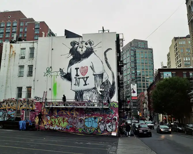 А это Бэнкси в Нью-Йорке. Точнее авторство Бэнкси, а рисовали ребята из Colossal. Всего крыс было три. Работа 2004 года.