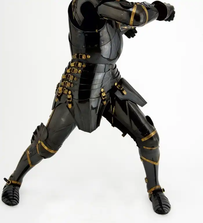 Этот красиво обработанный кислотным травильным раствором бронекостюм позднего средневековья уже не так похож на тяжеловесный панцирь, однако всё ещё создаёт впечатление громоздкой и неудобной брони. Тем не менее, он был создан специально для ношения и имеет определённые параметры, которые должны подходить под размеры хозяина, поэтому на человеке он будет смотреться намного лучше.