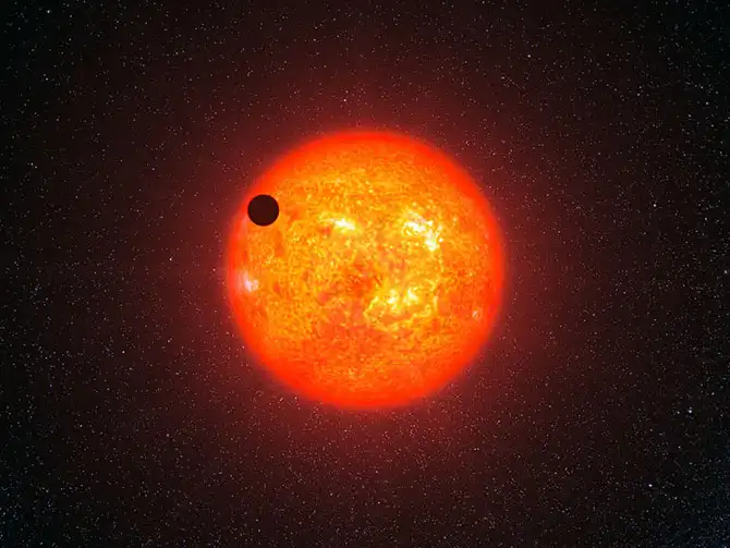 Возраст планетной системы оценивается в несколько миллиардов лет. Масса планеты составляет примерно 6,55 масс Земли, в то же время диаметр планеты превышает земной более чем в 2,5 раза. На этой картинке показано, как художник представляет себе прохождение сверхземли Глизе 1214b по диску своей звезды.