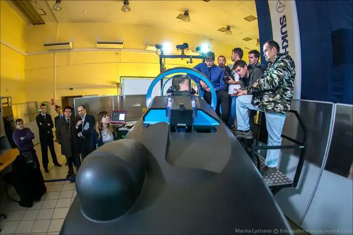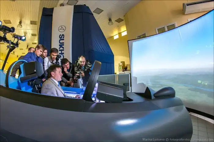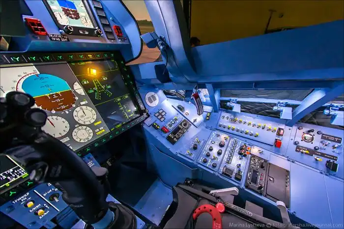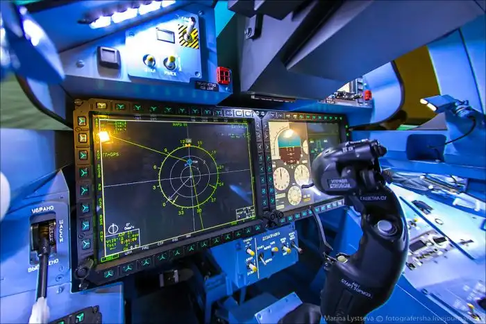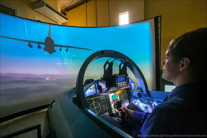 Рабочее место летчика Су-35 в комплексном тренажере представляет собой закрытую кабину вентилируемого типа, где есть все необходимое для комфортного выполнения боевых заданий.