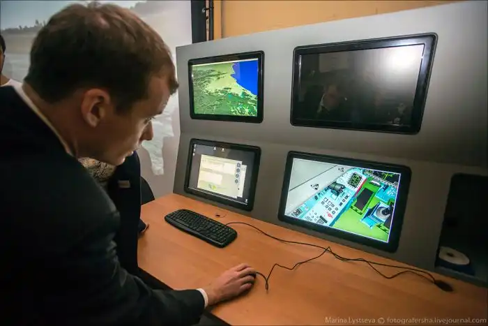 На РМИ (рабочее место инструктора) несколько мониторов. На трехмерной карте обозначены опорные точки, поворотные точки маршрута, какие-то цели. На другом мониторе он наблюдает действия летчика, органы и управления и параметры полета. На третьем общий вид тренажера и т.д..