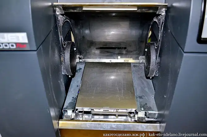 Принцип работы таков: в принтере есть емкость, в которую тонким слоем насыпается мелкодисперсный порошок, выравнивается, над ним проезжает каретка с картриджем и распыляет отвердитель разного цвета на нужные участки. Опять засыпается слой порошка, выравнивается, распыляется отвердитель, и так много раз. Слои настолько тонкие, что под ним видны предыдущие.