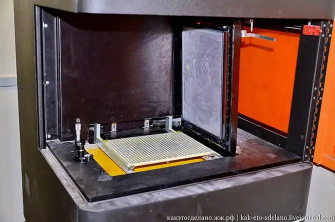 В этом принтере есть емкость с фотополимером, которая закрывается стеклянной крышкой. На него проектор сверху проецирует изображение. Программа переключает картинки на проекторе (срезы объекта) и по мере затвердевания модели металлическая пористая платформа постепенно опускается вниз. По мере расходования фотополимер доливается в кювету. Во время процесса печати аппарат закрывается, чтобы избежать засветки.