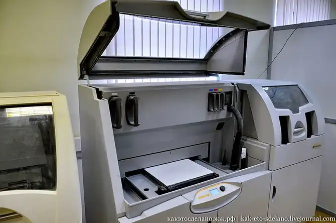 Далее наш рассказ будет о принтерах другого типа. Принтер слева работает по технологии MJM. В нем светоотверждение полимера происходит за счет ультрафиолетовой вспышки. Расплавленный горячий акриловый фотополимер (пластик) подается в печатающую головку, которая наносит его на печатающую платформу, где он засвечивается галогеновой ультрафиолетовой лампой, после чего он отвердевает, затем следующий слой и так далее.