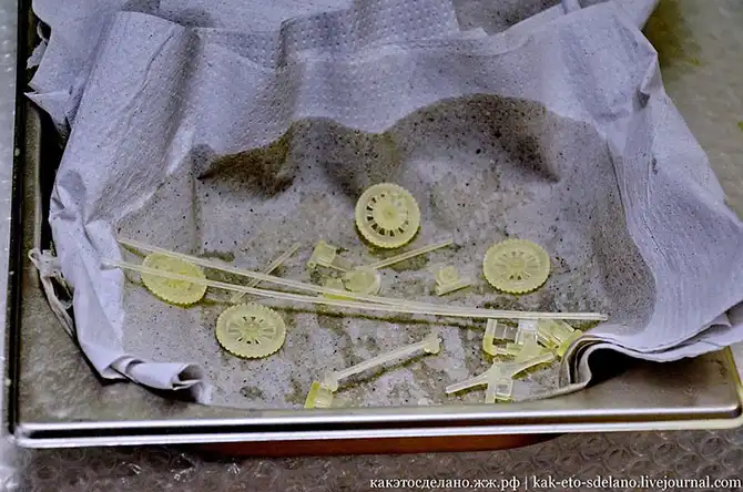 Обратите внимание на дно, весь порошок, который стряхнули с модели, идет обратно в производство, то есть оно практически безотходное. Затем тут же готовую модель пропитывают специальным суперклеем, потому что она все еще хрупкая, а с нее, возможно, еще будут делать формы и т.п.