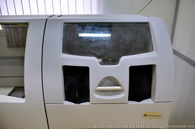 Но обо всем по порядку. Принтер подключен к компьютеру, который задает ему задачу распечатать с подготовленной в специальной программе 3D модели будущее изделие. Этот 3D принтер использует для печати композитный материал на основе гипса, который позволяет печатать с высоким разрешением, воспроизводя практически полную палитру цветов.
