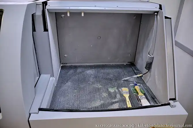 По окончании процесса, готовую модель осторожно извлекают из композита и помещают в эту кабинку, где при помощи воздуха из компрессора и мягких щеток, происходит очистка от порошка.