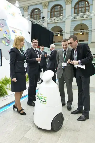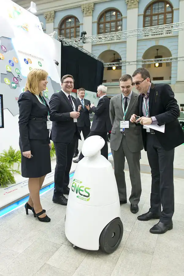 Разговариваем с роботом, который ездил по выставке и развлекал гостей. Приглашаем его зарядиться энергией от нашей биомассы. Обещал приехать в Томск.