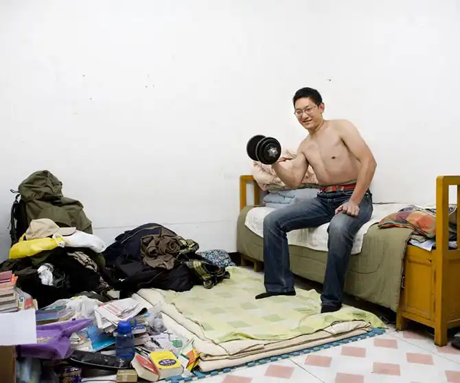 Бай живет в одном из так называемых «рабочих» домах. Они похожи на большие квартирные дома, но на каждом этаже около 20 комнат и одна ванная и кухня на этаж. Гигиена в этом месте оставляет желать лучшего. Бай любит каучсерфинг, потому что так он может общаться с иностранцами, практиковать английский и узнавать больше про иностранную культуру. Его комната – 3х4 метра. В ней есть кровать, стол и горы одежды, книг и других вещей на полу. Для гостей он достает надувной матрас. Там я и спал, на полу рядом с его кроватью в течение трех ночей, разделяя кухню и ванную с 20 китайскими студентами.