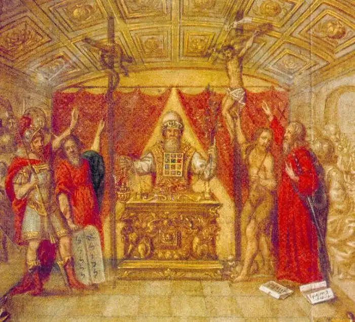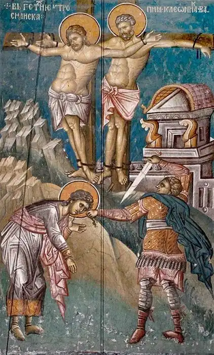 Слева на фреске Моисей, указующий на распятого Змия, исцеляющего тело, а справа – Иоанн Креститель, указующий на Иисуса, исцеляющего душу.