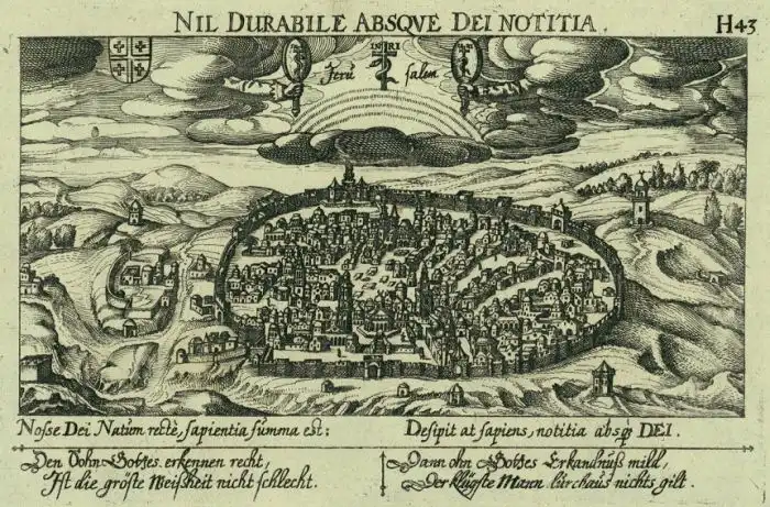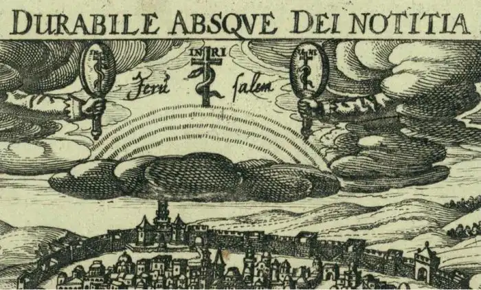Есть любопытная панорама Иерусалима, где Змей на кресте отражается в двух зеркалах, и, чтобы не было ошибки, Змей подписан инициалами Иисуса Христа Царя Иудейского. Вот фрагмент этой панорамы.