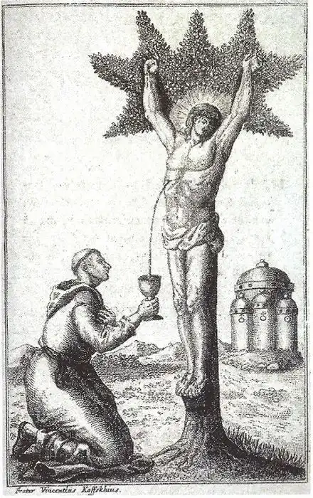 Вот еще одна картина – 1786 года с Иосифом Аримафейским, набирающим кровь Христа в священную чашу (Святой Грааль). Очень важно, что здесь не распятие, а дерево, — все ранние предания об Иисусе говорят как раз о сухом древе, к которому Иисус был подвещен.