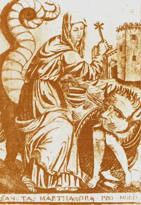 А вот Святая Марта из Тараскона, и она тоже держит чашу и тоже держит чудовище (пишут, что это дракон Тараск) на поводке. Василиск на поводке у дамы это вообще очень часто повторяющийся мотив.