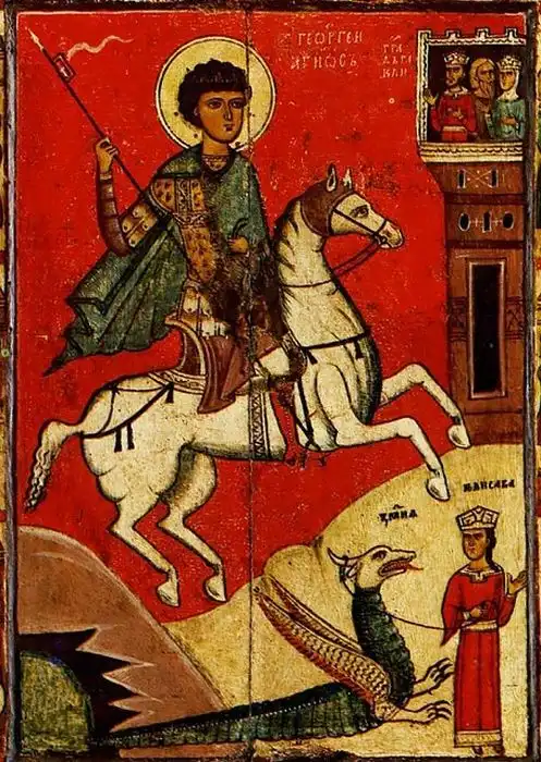 Эфиопы в Кибре Негаст пишут, что это сама царица Савская. Св. Георгий, уже ставший к тому времени монахом, навтыкал Змею вместе с двумя братанами-монахами. Змей успел таки плюнуть в царицу, отчего у нее и были потом проблемы с ногами. Православие эту часть легенды благоразумно утратило, но на иконе четыре последних буквы, означающие имя принцессы — Саба.