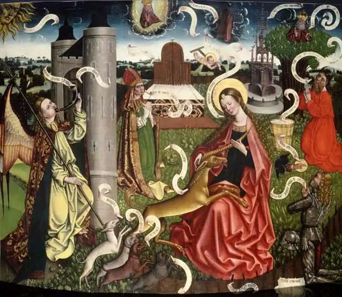Видите голубка, слетающего к ней из уст Бога-Отца? Как хотите, но мы видим перед собой Непорочное зачатие Девы Марии, многократно отраженное в средневековых преданиях под названием «Мистическая охота на Единорога». Вот картинка.