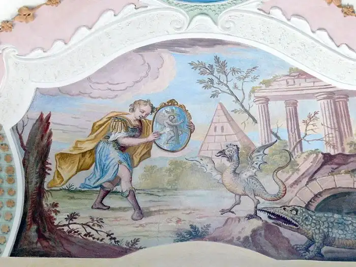 А вот обнаруженный реставраторами под слоем краски подчиненный ей Василиск.