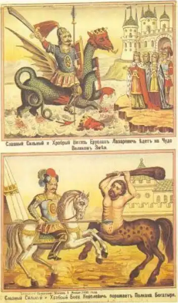 Эпизоды из лубочных сказок о Еруслане Лазаревиче и о Бове-Королевиче. Хромолитография-1890г.