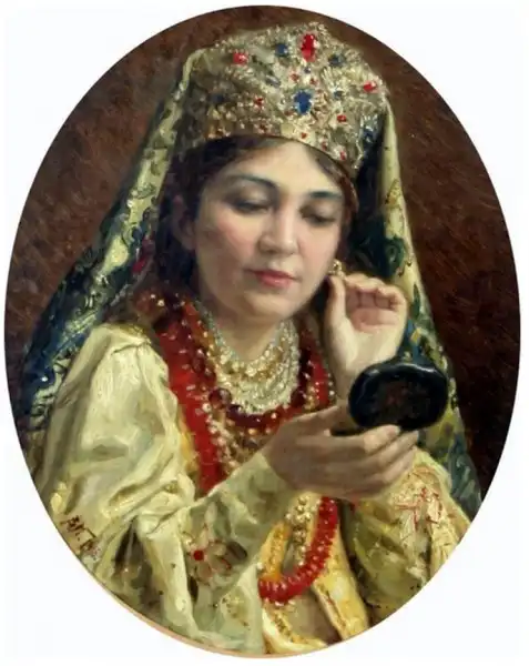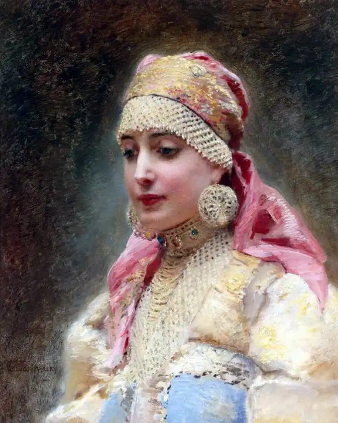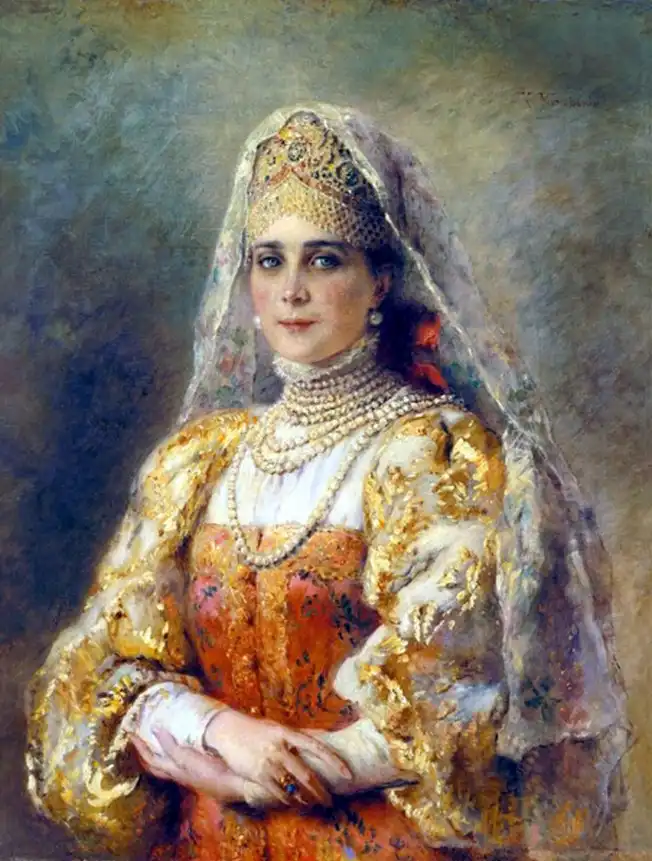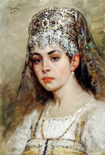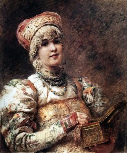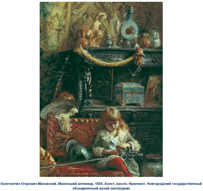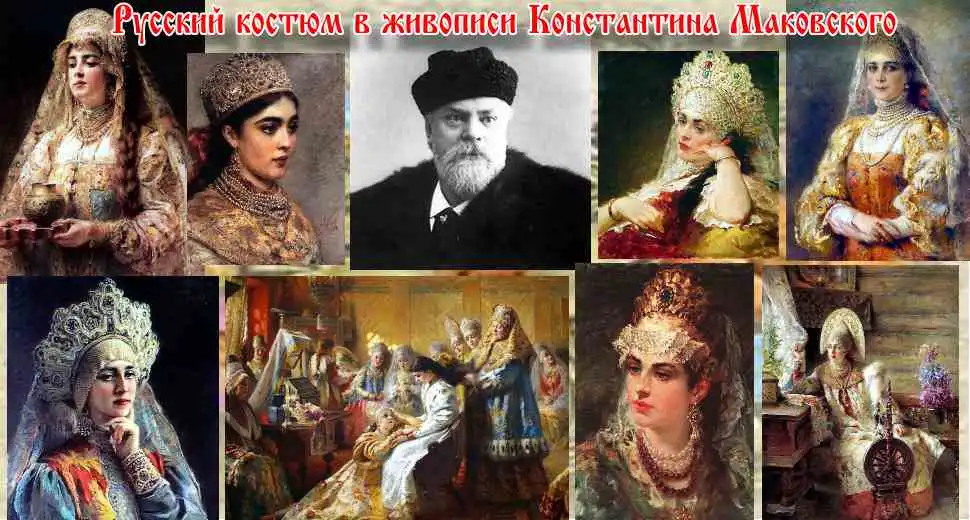 Ещё об одном из источников рассказывает, вспоминая своё детство, дочь художника Е.Лукш-Маковская: "Пришла продавщица старины из Александровского рынка, еврейка: известная старьёвщица, с помощницей, скупает со всех концов России сохранившиеся старинные уборы. Скупленные наряды у нее были большей частью с севера, и для Константина Егоровича у нее был большой выбор. И ставятся уже ларцы, развязывается большой узел, и прямо на блестящий паркет зала, против света больших окон на Неву падает с её рук целый поток материй, ложатся ломаными складками старинные платья, парчовые "кусочки". Оживлённо совещается папа с матерью, но увлекается и, жадный до каждой тряпицы, забирает зачастую всё, так ценил он русскую древность, был знатоком и не скупился на такие покупки". Благодаря таким приобретениям и коллекционированию, мы можем узнать, какие наряды были у наших предков на русской равнине и в Сибири. Известный путешественник нормандец Пьер Мартин де Ламартиньер около 400 лет назад был в экспедиции на Новой Земле, Печоре, побывал во многих местах Сибири и оставил нам зарисовки и описания сибиряков. Так, что у Ламартиньера, у Пушкина в русских сказках, у Маковского в его картинах, нет особых различий. Это не сказочные персонажи, а обычные наряды русского народа, проживающего в разных частях своей страны.