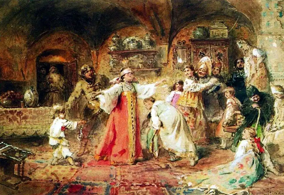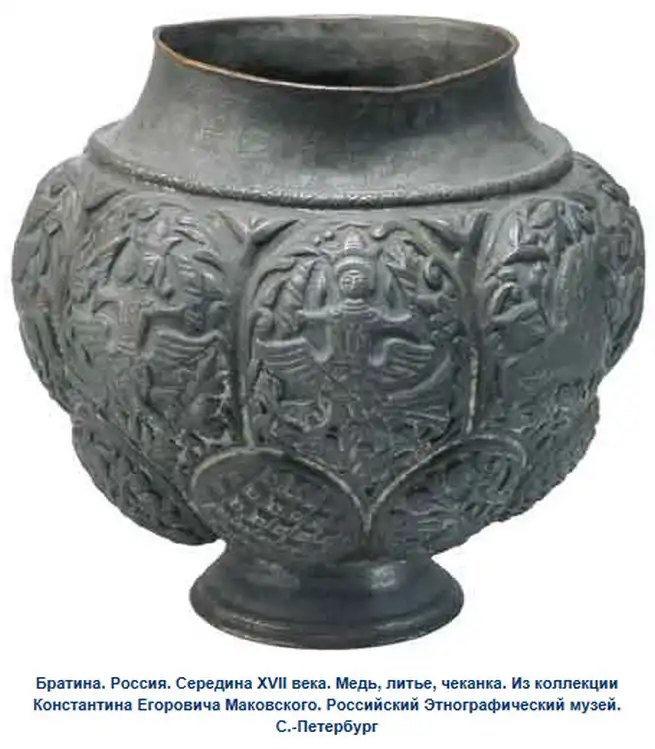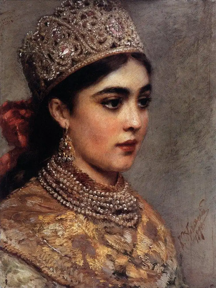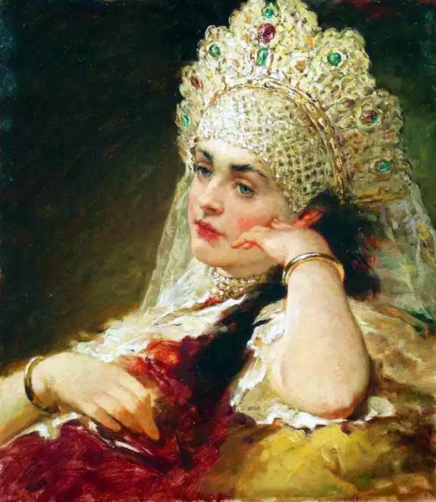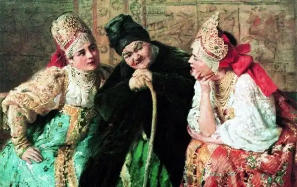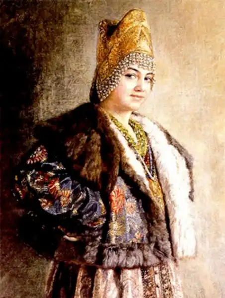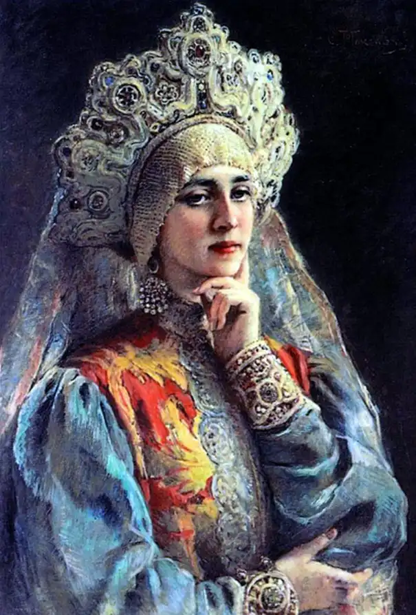 Ещё об одном из источников рассказывает, вспоминая своё детство, дочь художника Е.Лукш-Маковская: "Пришла продавщица старины из Александровского рынка, еврейка: известная старьёвщица, с помощницей, скупает со всех концов России сохранившиеся старинные уборы. Скупленные наряды у нее были большей частью с севера, и для Константина Егоровича у нее был большой выбор. И ставятся уже ларцы, развязывается большой узел, и прямо на блестящий паркет зала, против света больших окон на Неву падает с её рук целый поток материй, ложатся ломаными складками старинные платья, парчовые "кусочки". Оживлённо совещается папа с матерью, но увлекается и, жадный до каждой тряпицы, забирает зачастую всё, так ценил он русскую древность, был знатоком и не скупился на такие покупки". Благодаря таким приобретениям и коллекционированию, мы можем узнать, какие наряды были у наших предков на русской равнине и в Сибири. Известный путешественник нормандец Пьер Мартин де Ламартиньер около 400 лет назад был в экспедиции на Новой Земле, Печоре, побывал во многих местах Сибири и оставил нам зарисовки и описания сибиряков. Так, что у Ламартиньера, у Пушкина в русских сказках, у Маковского в его картинах, нет особых различий. Это не сказочные персонажи, а обычные наряды русского народа, проживающего в разных частях своей страны.