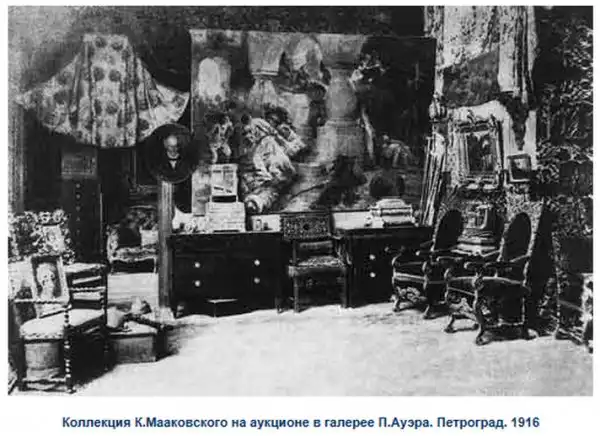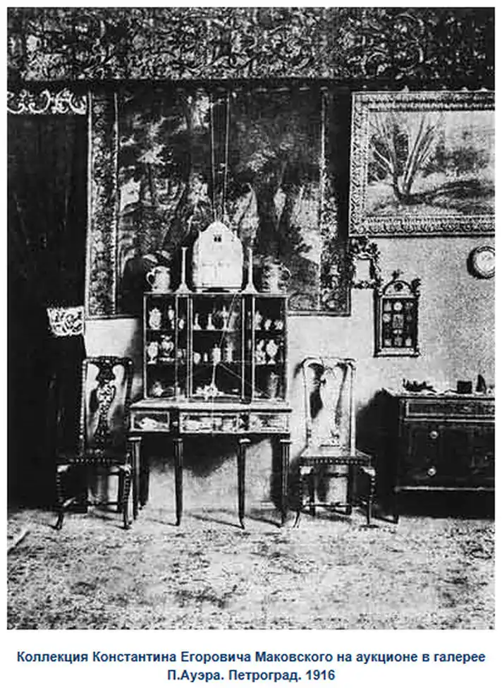 В начале марта 1916 года в Петроградских газетах появились объявления о "богатом" аукционе "имущества, оставшегося после смерти знаменитого художника и коллекционера профессора Императорской академии художеств Константина Георгиевича Маковского". Прошло всего полгода как художника не стало в результате трагического случая. Сбитый уличной пролёткой на одной из улиц Петроградской стороны, он получил тяжёлую травму головы, от которой 17 сентября 1915 года скончался. В каталоге, сопровождавшем аукцион, перечислено 1100 предметов.