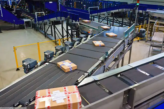 Машина для сортировки бандеролей и посылок. После кодирования и взвешивания посылка попадает к операторам станции, которые должны положить её на ленту штрих-кодом вниз на специальное окно, где происходит считывание кода для распределения посылок.