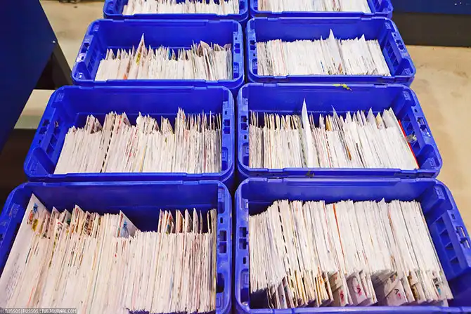 После обработки письма автоматически разделяются по адресным ячейкам. Операторы вынимают из ячеек пачки разделенной почты и укладывают в контейнеры, которые отправляются на заключительные этапы сортировки — подготовку почтовых документов и отправку по направлениям.
