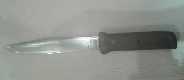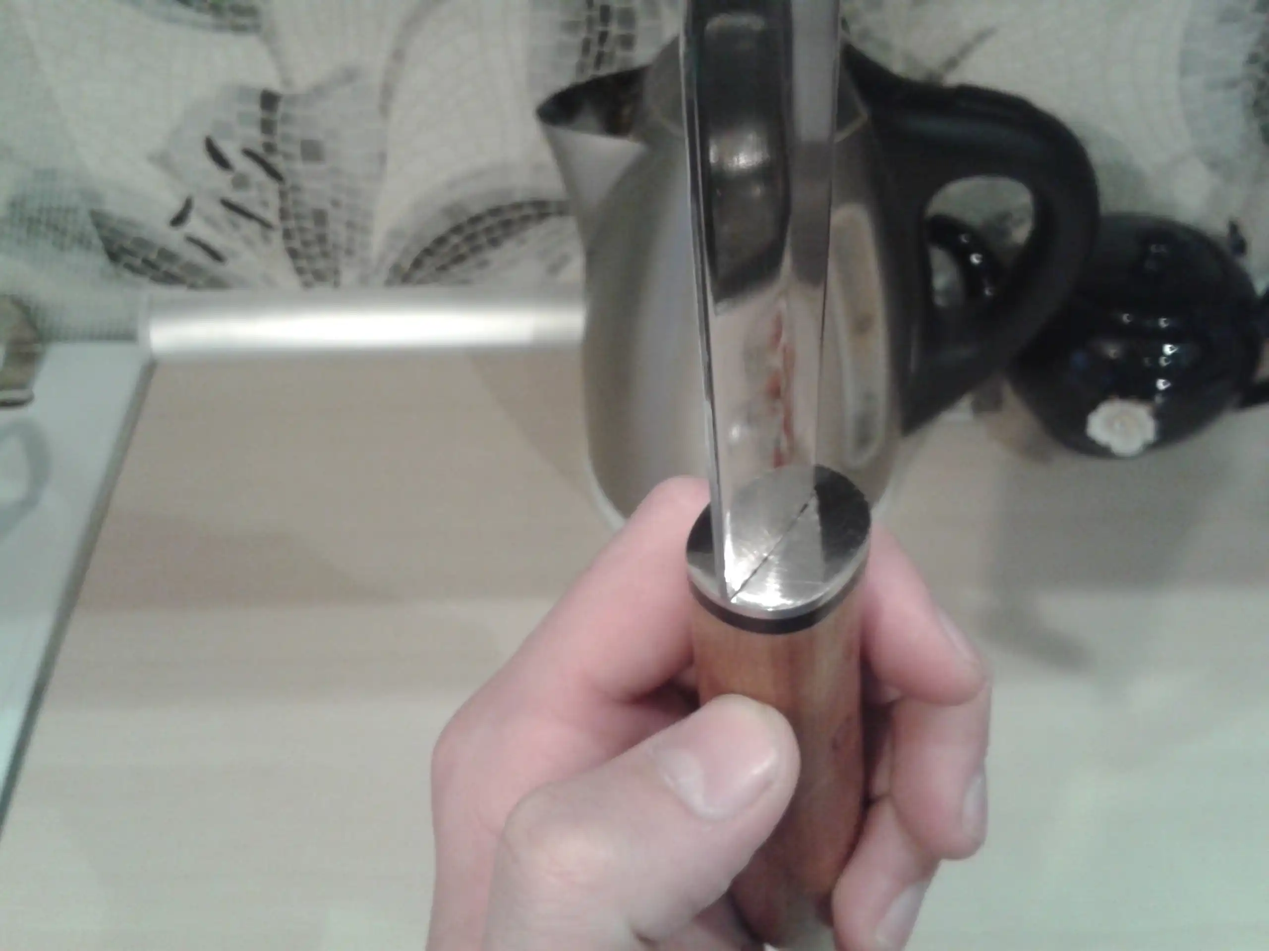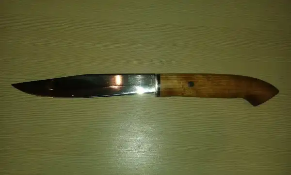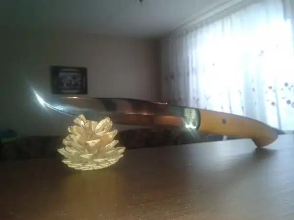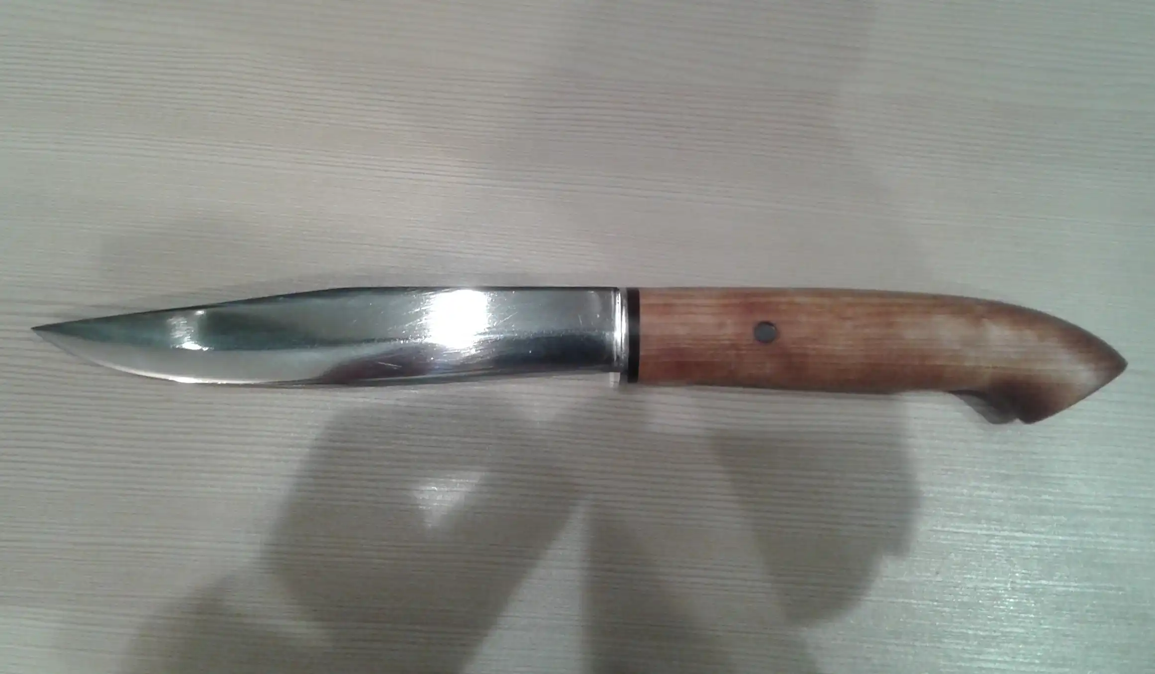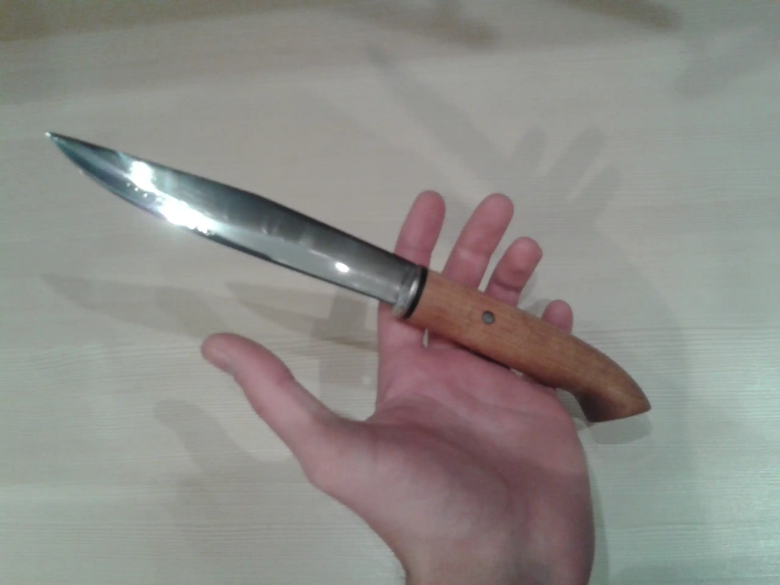 PS: Из какой стали клинок я не знаю, ручка из какого дерева тоже не знаю взят кусочек из круглой подставки для флага :) подставка склеена была из брусков выбрал самый темненький :) может кто и разбирается то скажите что за дерево (не смольное, пилилось с трудом, переливается на свету красиво).