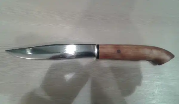 Больстер (это метал. пластина разделяющая рукоять и клинок) сделал из монеты достоинством в 5 юбилейных советских рублей.
