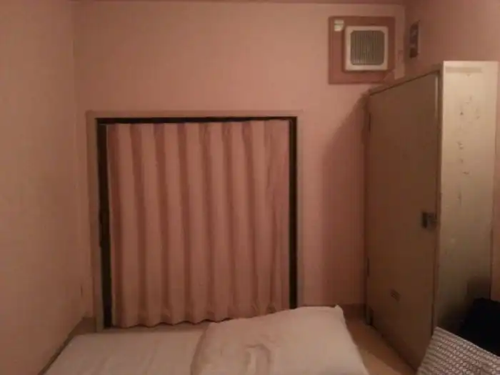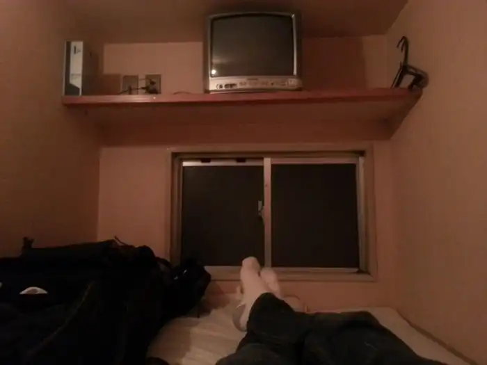 Ноги специально для масштаба. Парень среднего роста и практически вся длин комнаты равняется его росту. Телевизор + 100 йен в день. Этот оказался нерабочим и его пришлось менять. Ах, да... Не обольщайтесь насчет окна. Это бутафория и причем закрытая на замок.