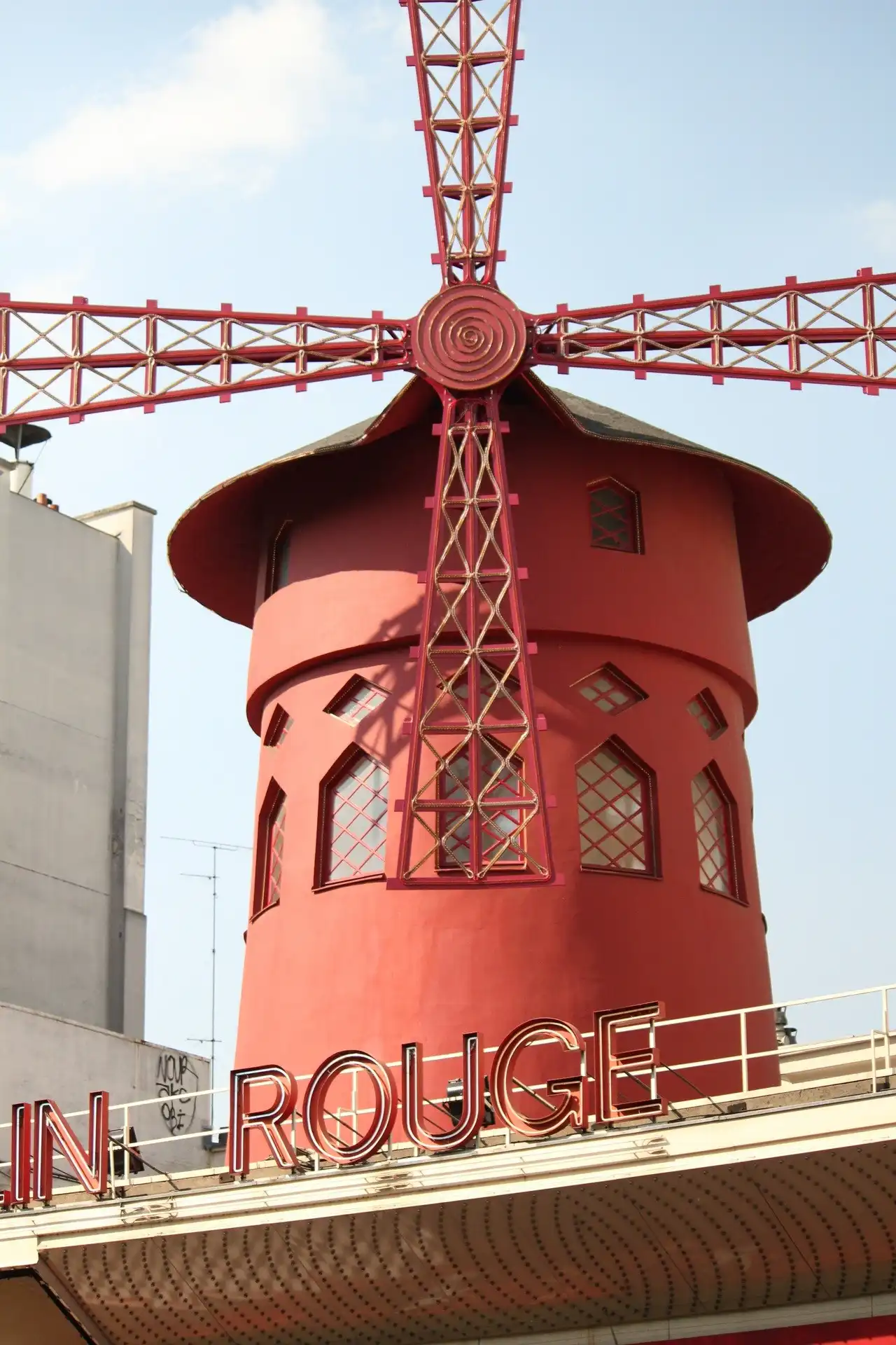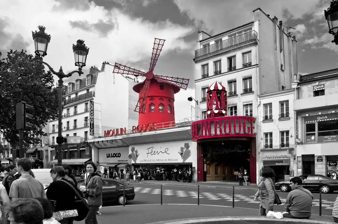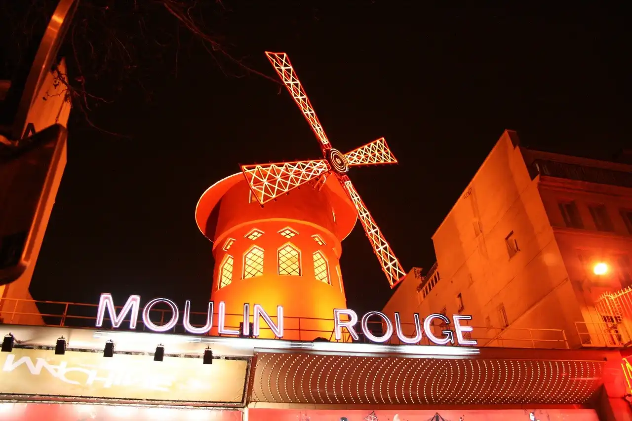 Самый высокий холм Парижа — Монмартр. До середины XIX века он был известен своими виноградниками и мельницами. Ныне на Монмартре осталась только одна, но зато самая узнаваемая — Красная мельница, в переводе — «Мулен Руж», известное на весь мир кабаре с феерическим танцевальным шоу и конечно знаменитым традиционным французским канканом.Французы говорят: » Кто был в Париже и не посетил Мулен Руж, тот не сможет до конца понять, что же такое Париж». Ведь Мулен Руж — это тоже часть истории Парижа, это больше чем мелодраматическая история, рассказанная в одноименном фильме, это — символ. Символ сбывшихся и несбывшихся надежд, разбитых и соединившихся сердец, творчества и порока, красоты и безобразия.