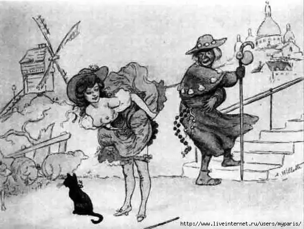 Внимательный взгляд увидит, что на этом забавном charge того времени символично расположены все символы Монмартра — служитель церкви, все еще взбирающийся вверх, по ступенькам на холм к базилике Sacre-Coeur (читай — к раю!), но уже (sic!) с оглядкой; черный кот, перешедший ему дорогу и расположенный ниже — символ греха и одноименного греховного кабаре; хозяйка порока (читай — кота!) юная мадемуазель, снизу, (читай — из греховного ада!) исподволь соблазняющая служителя, и, конечно же, расположенная слева (sic!) мельница, этот уже новый Олимп… Ведь теперь там, в Moulin-Rouge, всех крестят в эту новую веру!