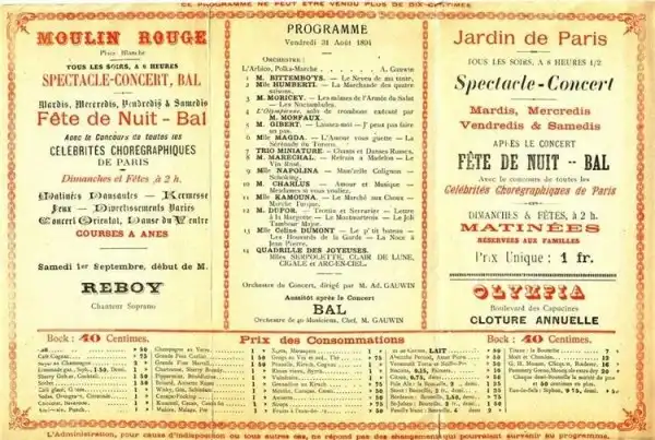 Датой рождения Мулен Ружа стал день 6 октября 1889 года, когда господа Оллер и Зидлер впервые открывают двери кабаре «Бал Мулен Руж». Гениальная идея — кадриль, ставшая бессмертным творением, прозванным в дальнейшем с легкой руки англичан «французским канканом», идентифицируется с тех пор со знаменитой красной мельницей, венчающей здание театра в районе Монмартра.