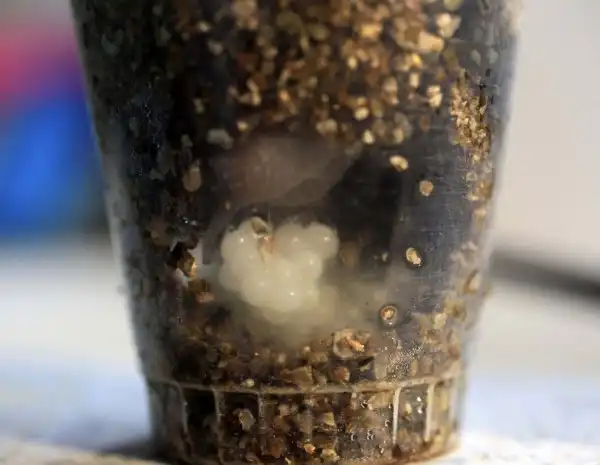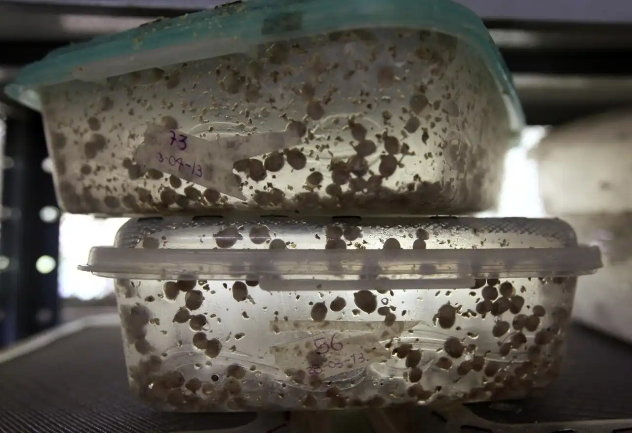 Яйца садовых улиток (Helix Aspersa) в специальном контейнере. Фотография сделана на улиточной ферме в Чоачи, Колумбия, 3 мая 2013 года. Фото: REUTERS/Jose Miguel Gomez