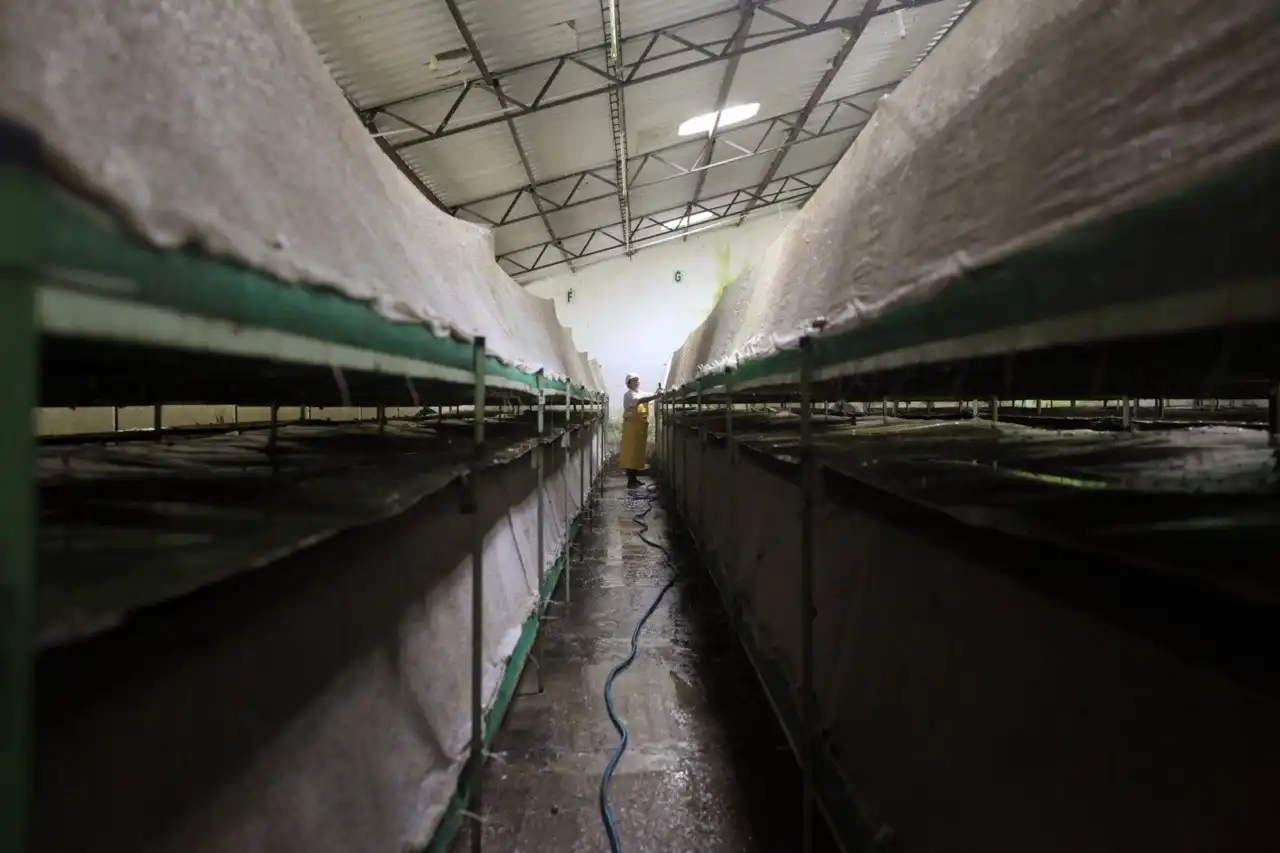 Сотрудник обмывает панели, где держат садовых улиток (Helix Aspersa), на ферме в Чоачи, Колумбия, 3 мая 2013 года. Фото: REUTERS/Jose Miguel Gomez