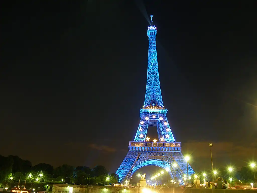 9 мая 2006 года, в честь 20-летия празднования Дня Европы, Эйфелеву башню впервые на короткий период подсветили синим цветом. А с 1 июля по 31 декабря 2008, во время председательства французского президента в Совете Европейского Союза, она на долгое время кардинально поменяла свою традиционную подсветку.