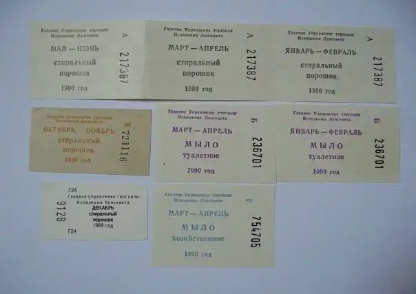 Талоны на продукты питания и некоторые товары народного потребления получались по месту прописки в ЖЭУ (или общежитии для студентов ВУЗов), на другие товары народного потребления талоны получались по месту работы (обычно, в профкоме).