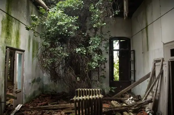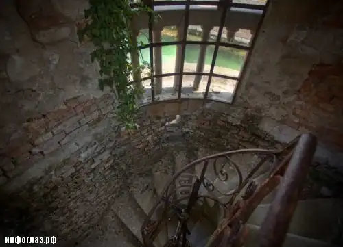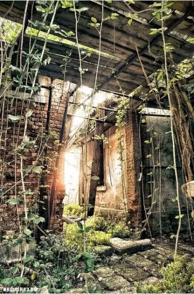 Границы между внутренним и внешним пространством практически стерты временем: балки перекрытий обрушились, потолок и оконные проемы затянулись плотной стеной из лозы.