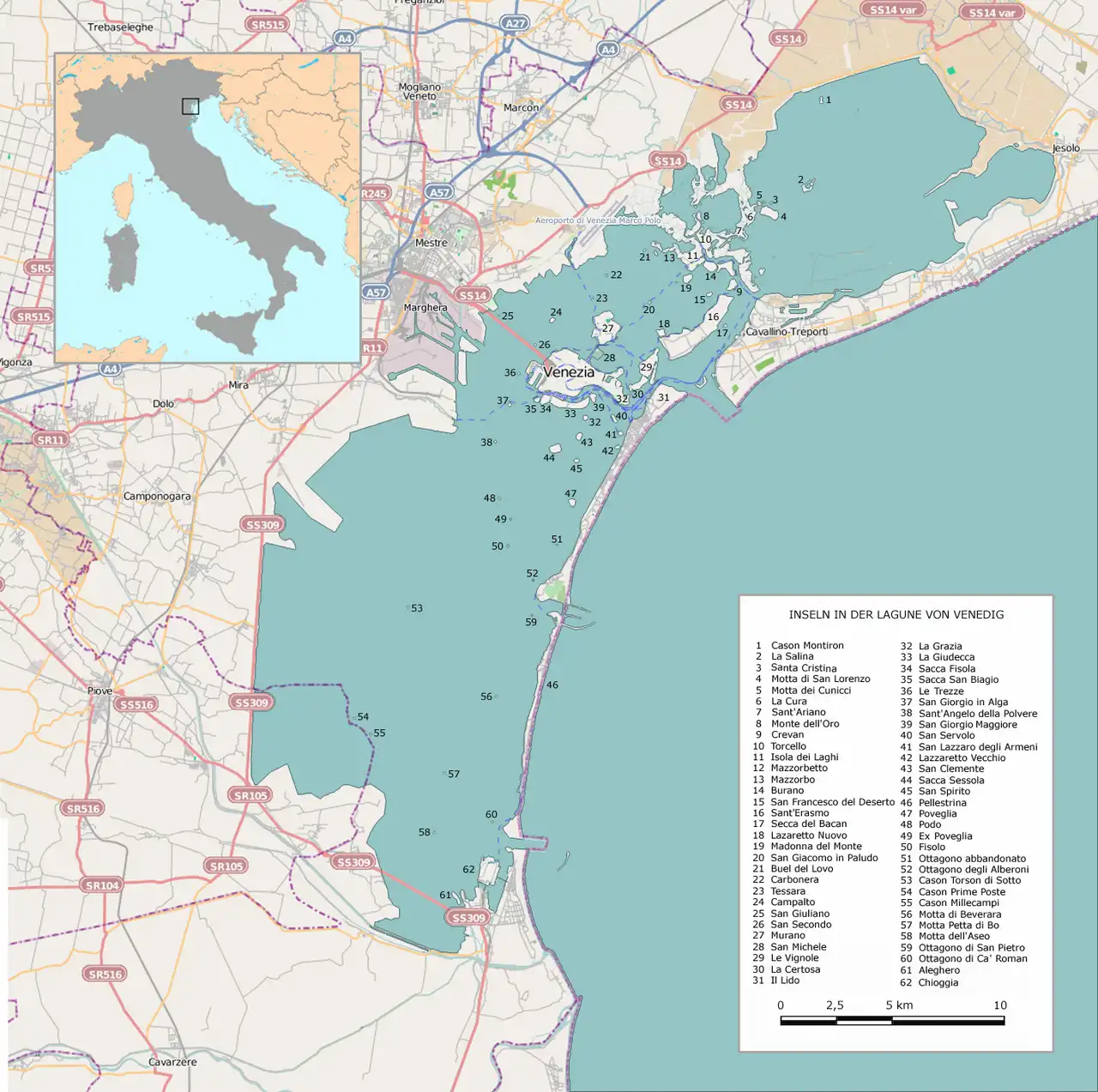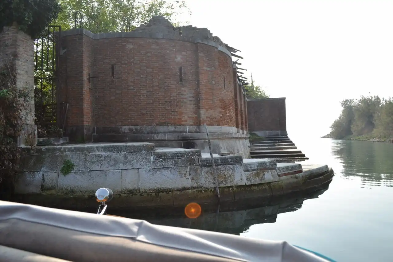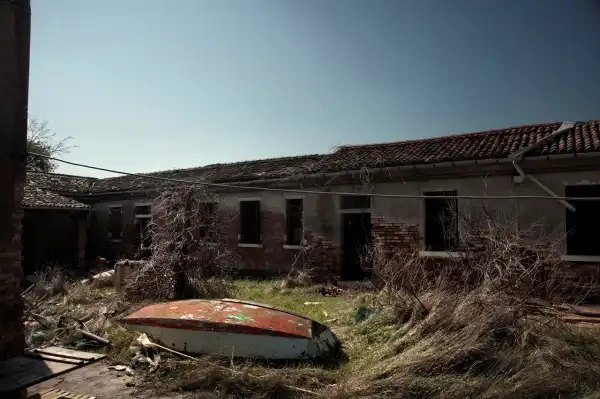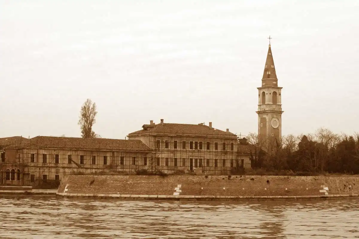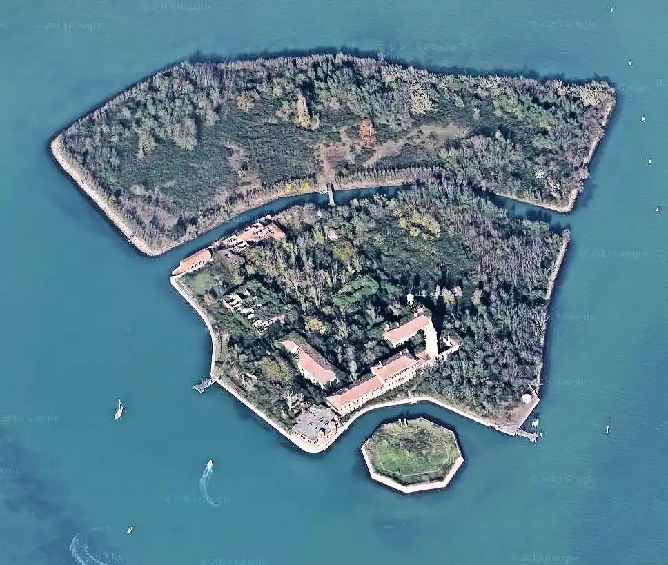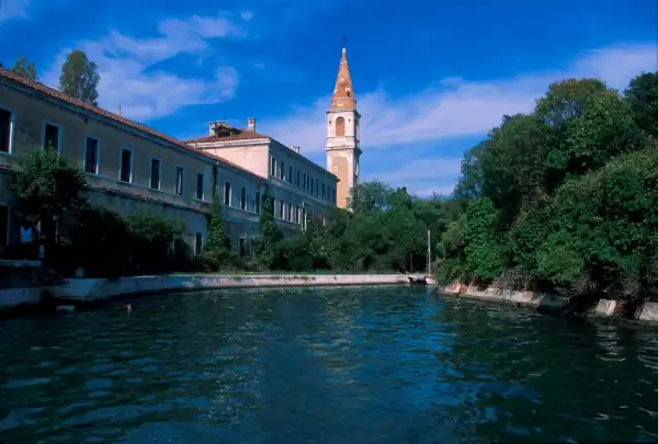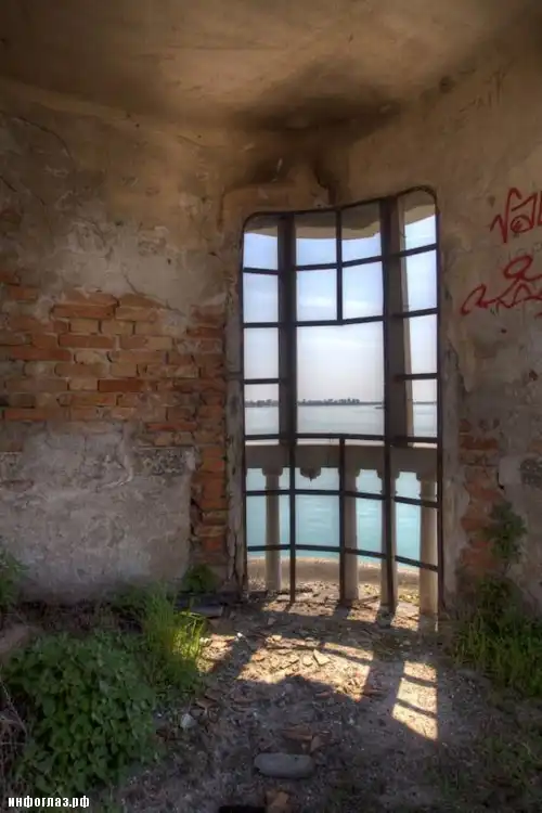 Оминув одну из сторон восьмиугольника, вы попадаете в узкий пролив, над которым, затерянное в густой поросли из деревьев и кустов, возвышается главное здание бывшей психиатрической больницы. Конечно, по словам венецианских властей, сооружение могло использоваться и в ином назначении, но его угрюмый вид никак не располагает к представлениям о доме отдыха для престарелых. Однако, в одной историко-документальной книге говорится, что в последние годы оно использовалось, как приют для бездомных.