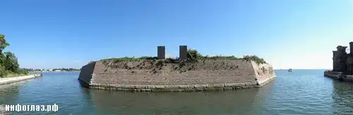 Следуя далее, вы увидите странное восьмиугольное оборонительное сооружение, возведенное непосредственно возле острова – это так называемый «кристалл или октагон». Он был построен в 14 веке для отражения венецианцами генуэзских атак.