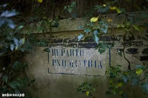 Но давайте вернемся к страшилкам о сумасшедшем доме, построенном в 1922 году, и его обитателях. По крайней мере, некоторые здания действительно были отведены под лечебницу, о чем свидетельствуют следующая надпись и оконные решетки, практически полностью поглощенные плющом и кустарником.