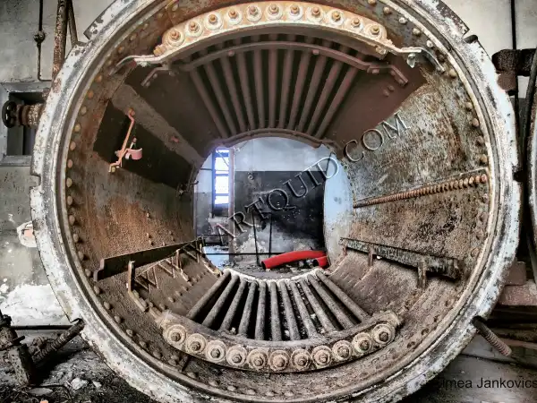 Эта лестница находится в здании, наполненном каким-то зловещим и пугающим промышленным оборудованием, назначение которого трудно объяснить. Она ведет на крышу, где через окна маленьких смотровых башен открывается невероятно красивый вид на залив.