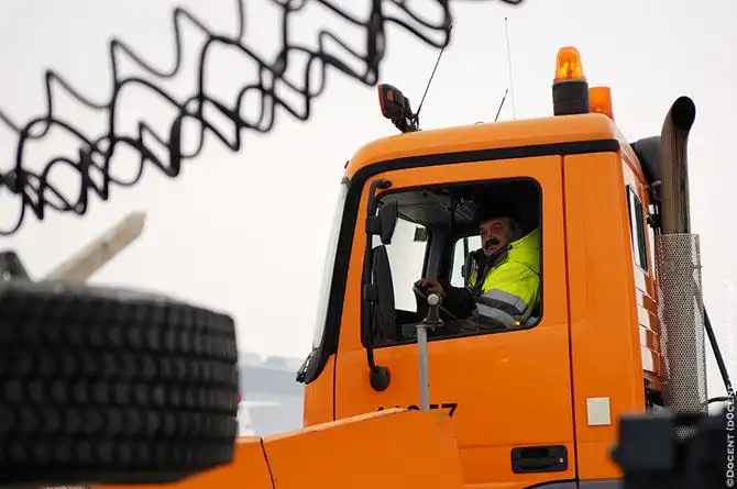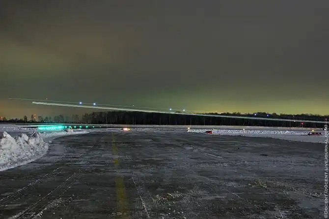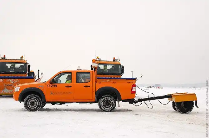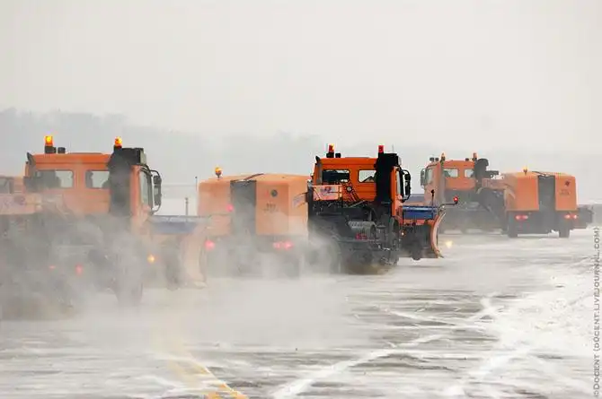 Тем временем одну из взлетно-посадочных полос аэродрома закрывают для уборки и колонна уборочной техники выдвигается на ее обработку. Закрытие полосы не повлияет на работу аэропорта Домодедово, так как есть вторая полоса.