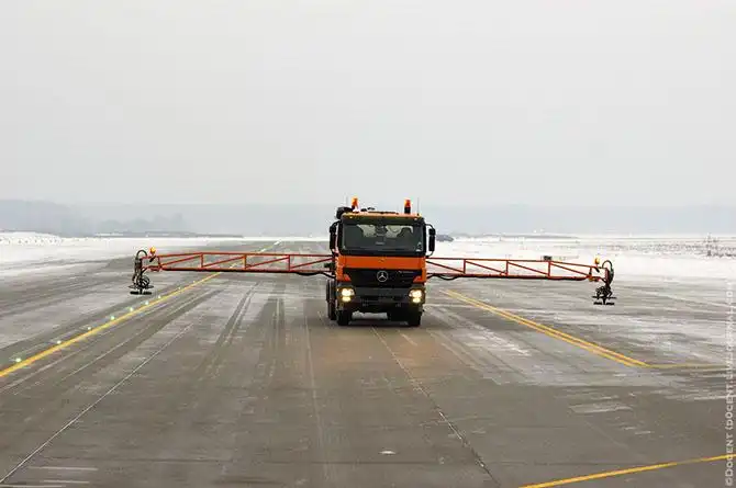 Вот эта машина обычно замыкает «парад» уборочной техники и проверяет сцепление покрытия на ВПП. Если коэффициент не удовлетворяет требованиям обработку повторяют.