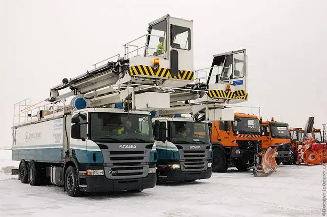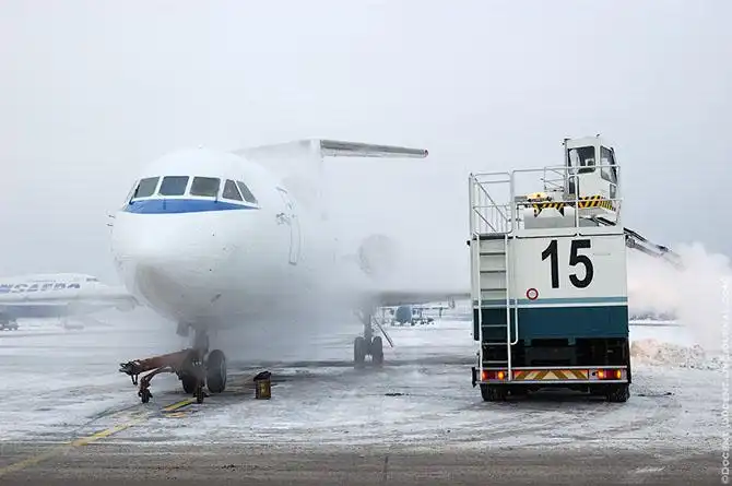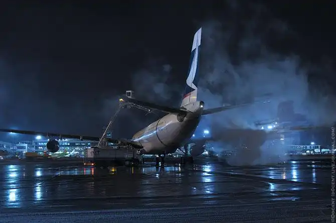 Перемещаемся на стоянку, где самолеты ожидают обработку противоледным реагентом. Обработку производят непосредственно перед вылетом, так как именно в момент взлета и набора высоты велика вероятность опасного обледенения крыльев и хвостового оперения.
