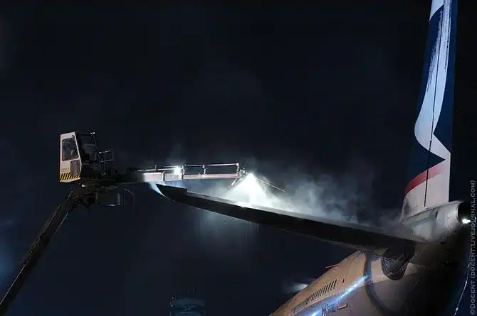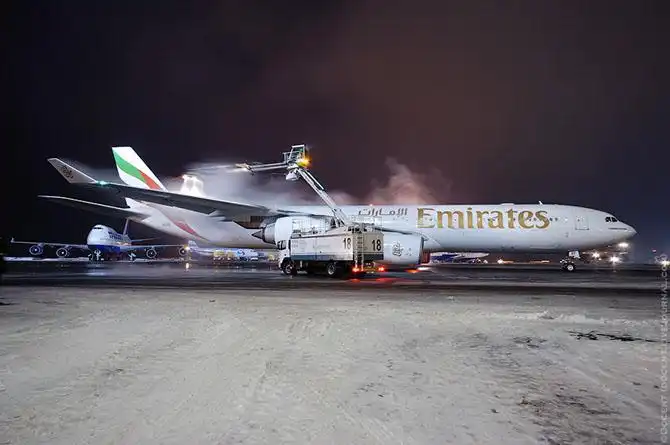 Конечно эффектней всего деайсинг смотрится в темное время суток. Обрабатывают самолет компании Emirates.