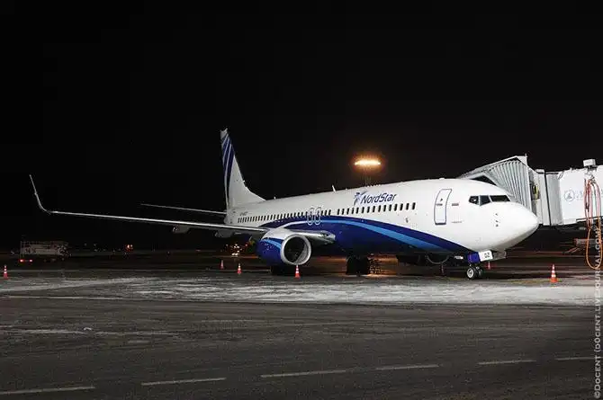 Обработанный противообледенительной жидкостью борт буксируют на взлетную полосу: пассажиры могут быть спокойны, обледенение самолету не грозит.